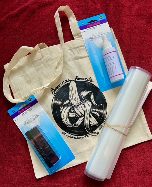 Makes a great gift! Includes stylus and record cleaner, record cleaning spray, and 50 3-mil 12″ plastic sleeves and a Bananas’ tote bag. Pairs nicely with a Bananas gift card
